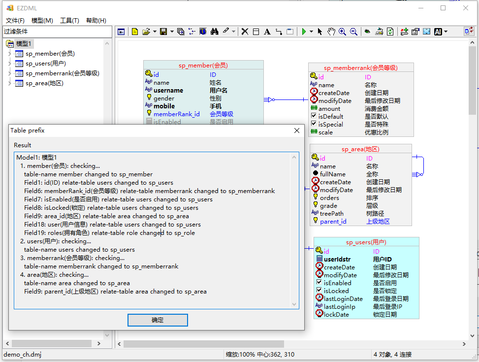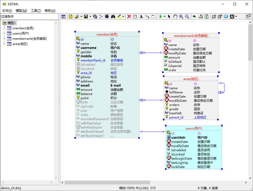 打开自带示例demo_ch.dmj,整个模型生成不太容易,我们只生成四个表。将左上角四个表拷下来,新建一个文件,粘贴: