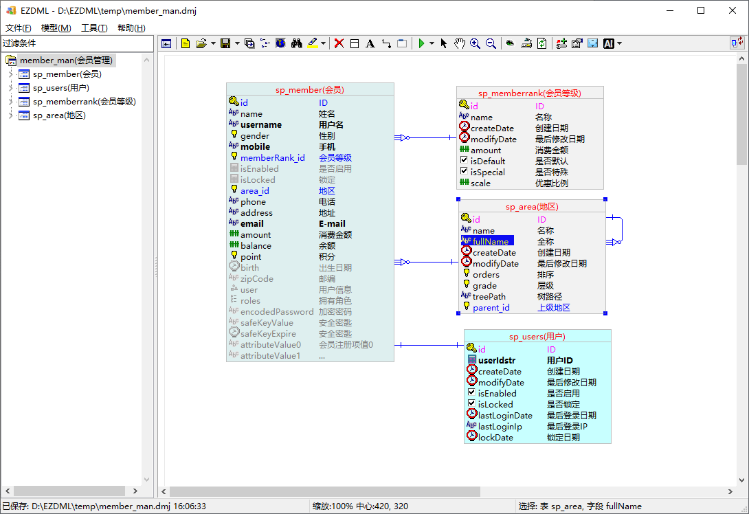 把sp_area的fullName是blob类型,这个会引起麻烦,我们把它改为String,同时把模型改名为“member_man(会员管理)”,保存: