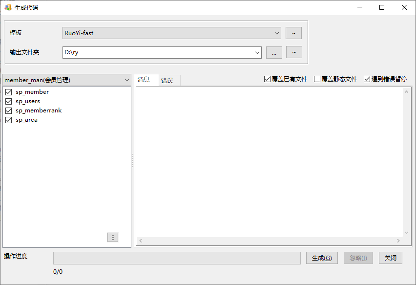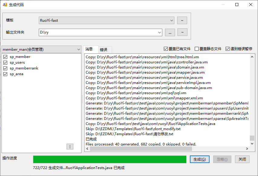 执行菜单命令:模型|生成代码,选择Ruoyi-fast,并指定输出到D:\ry: