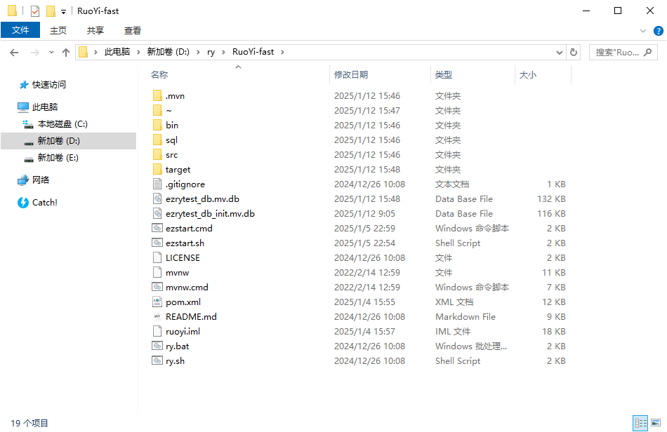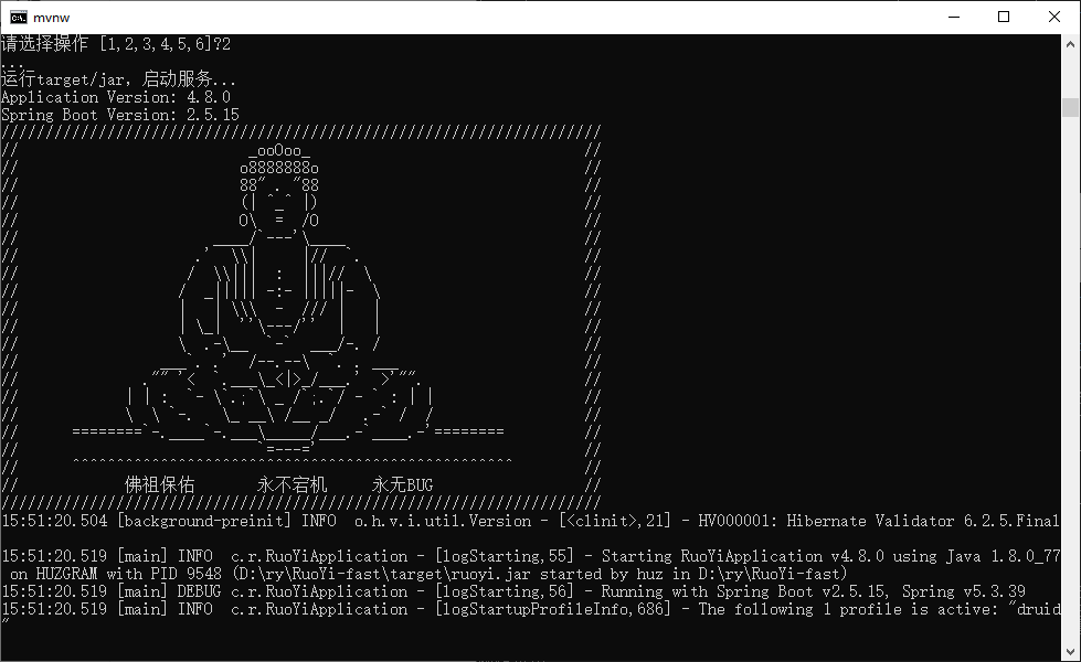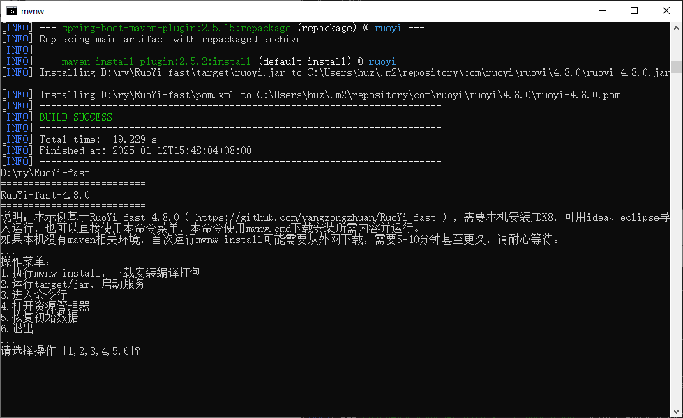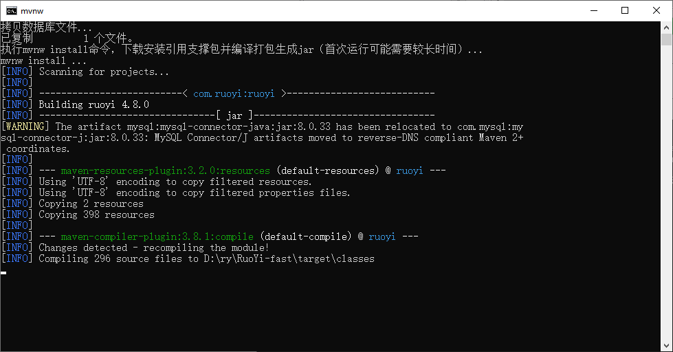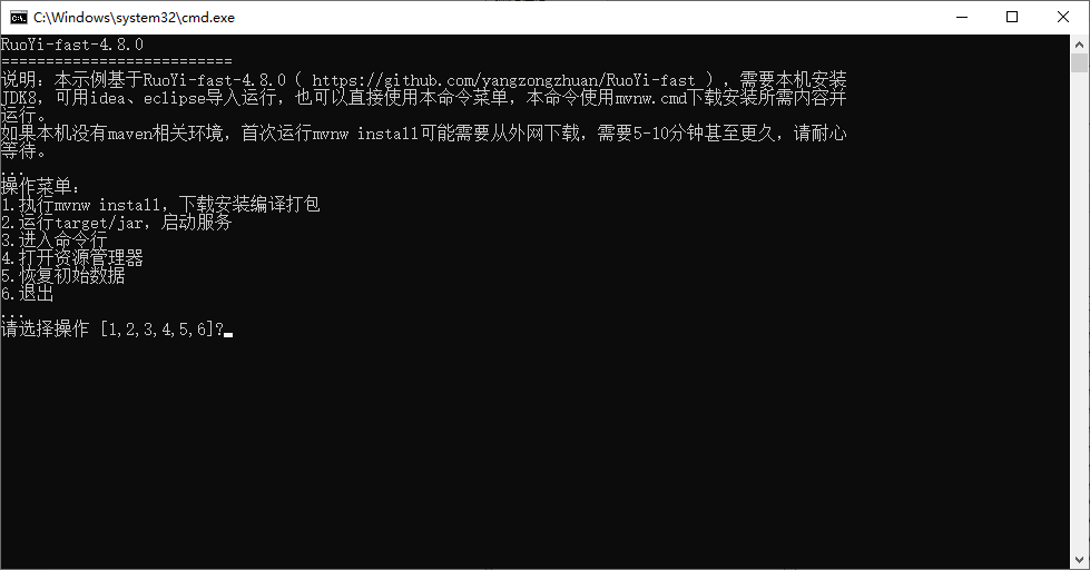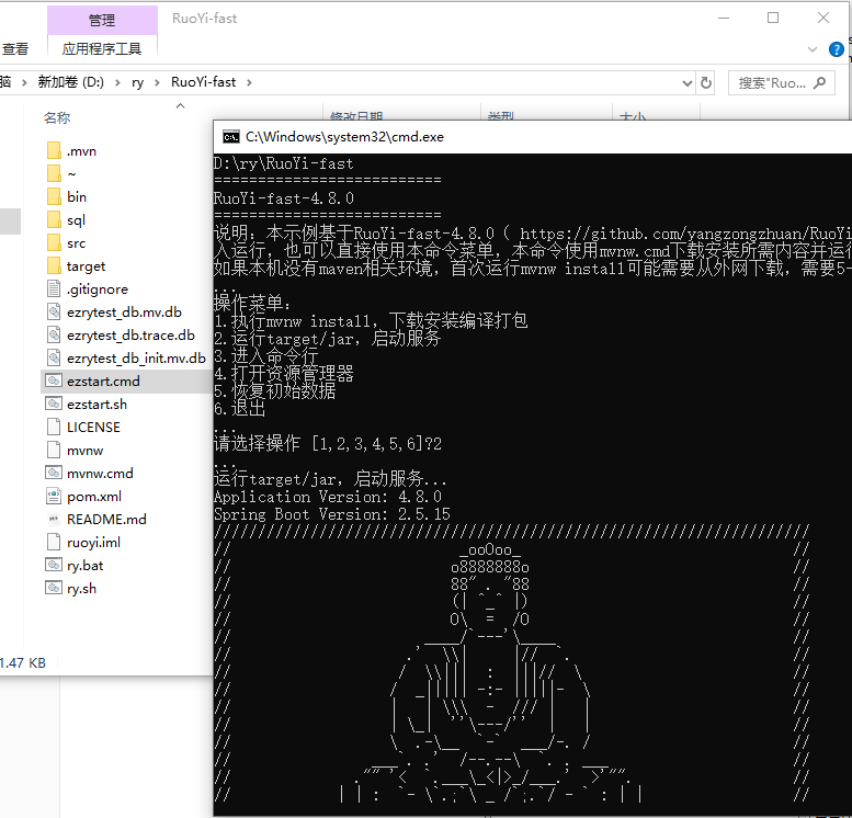 关闭EZDML(或手动断开数据库连接),打开D:\ry\RuoYi-fast目录,运行ezstart.cmd,输入命令2运行,