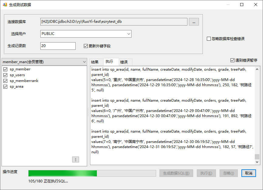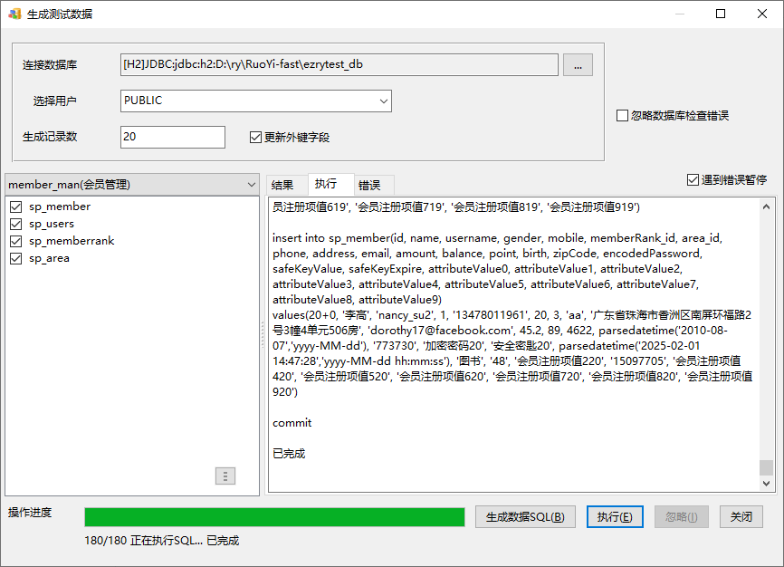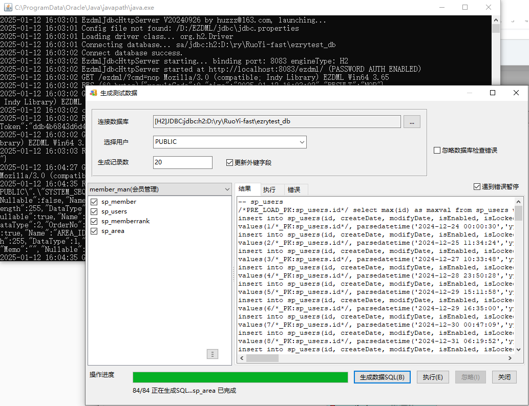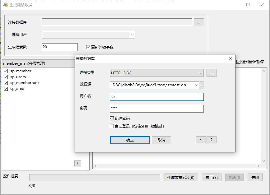 选择HTTP_JDBC连接类型,数据源指向生成目录下的ezrytest_db.mv.db”(.mv.db要省略),用户名sa,密码1234,连接后选用户为PUBLIC,生成数据SQL: